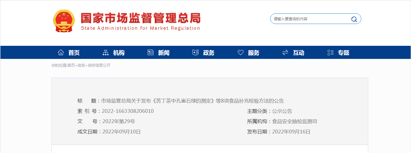 市场监管总局关于发布《苦丁茶中孔雀石绿的测定》等8项食品补充检验方法的公告