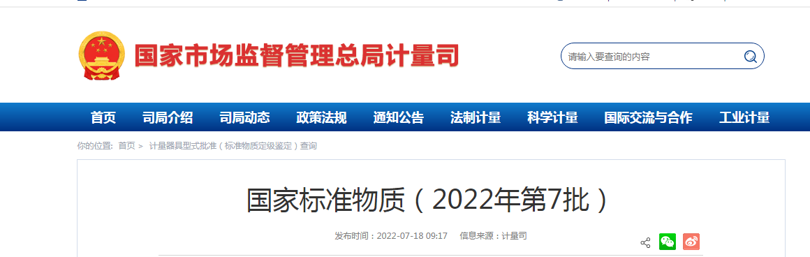 国家市场监督管理总局计量司公告-国家标准物质(2022年第7批)
